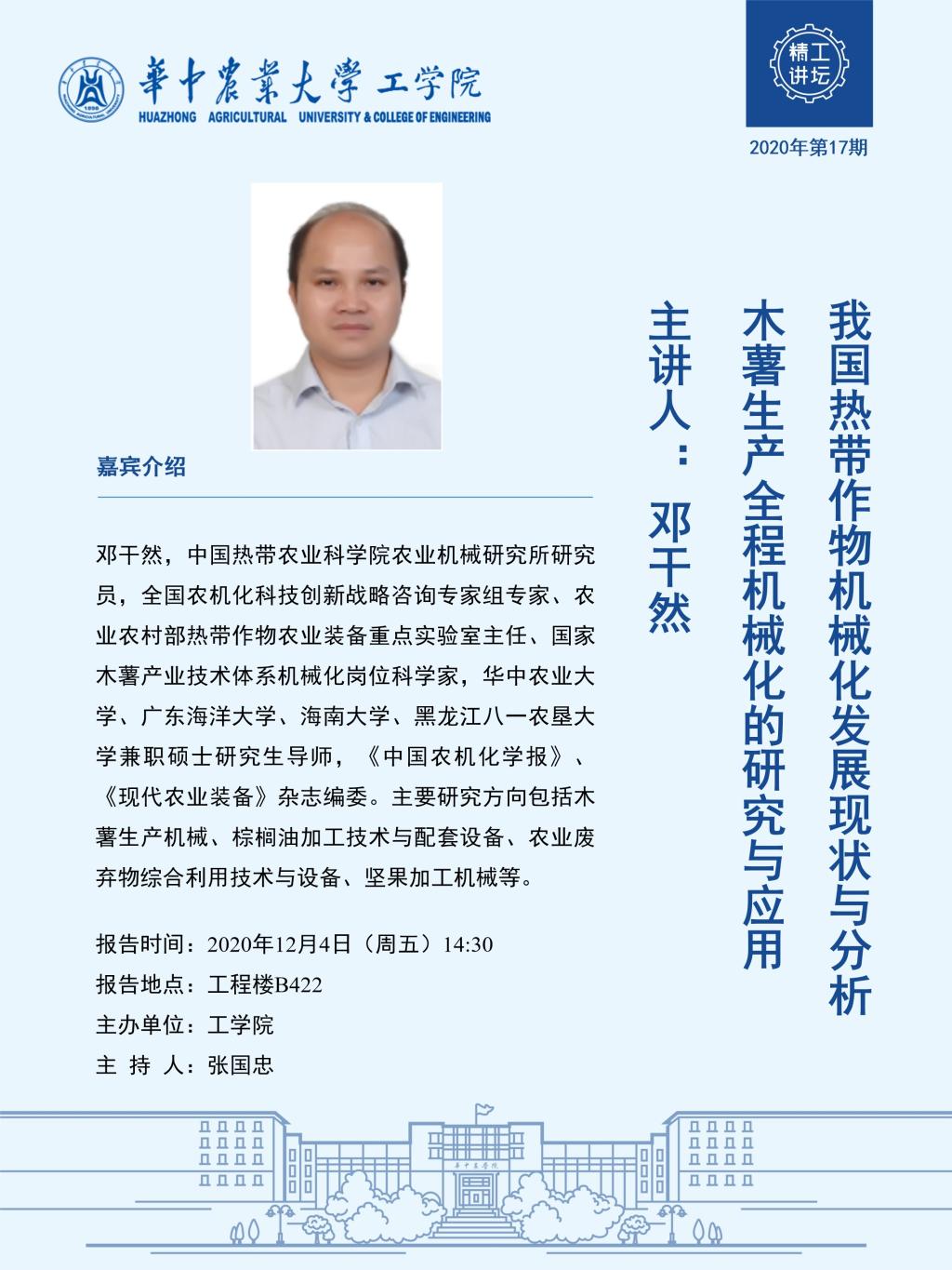 精工讲坛2020年第17期:我国热带作物机械化发展现状与分析、木薯生产全程机械化的研究与应用