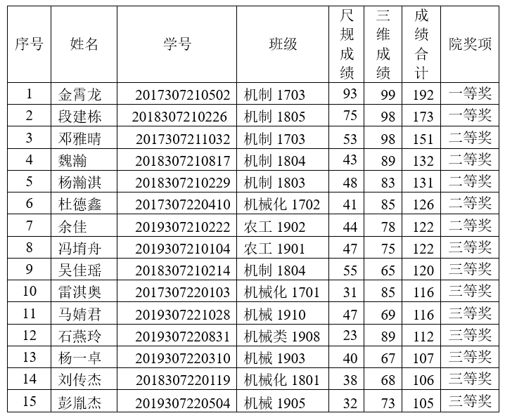2020年华中农业大学机械制图竞赛暨第十三届“高教杯”全国大学生先进成图技术与产品信息建模创新大赛校内选拔赛已经结束,先将结果公布如下: