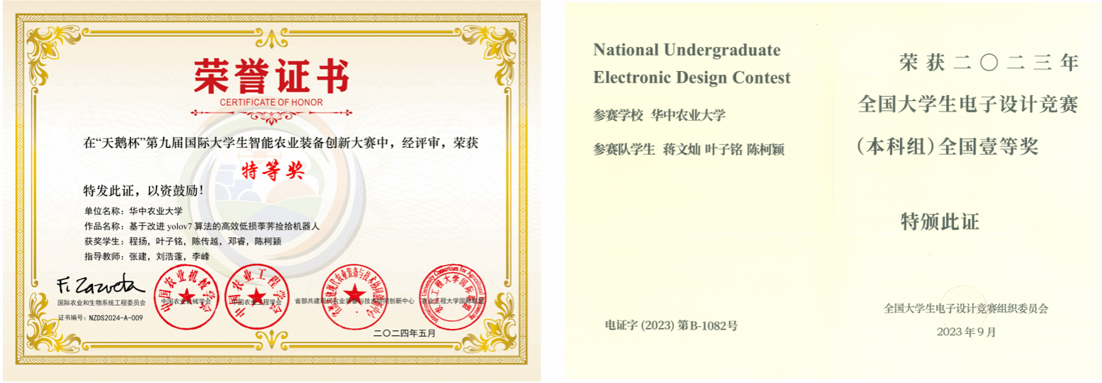 2024年,在全国智能农机装备大赛中,获国家特等奖1项、一等奖3项、二等奖3项;在“挑战杯”、中国国际大学生创新大赛中,均获湖北省金奖;在第十一届中国青年创青春大赛中,获国家金奖,取得云顶