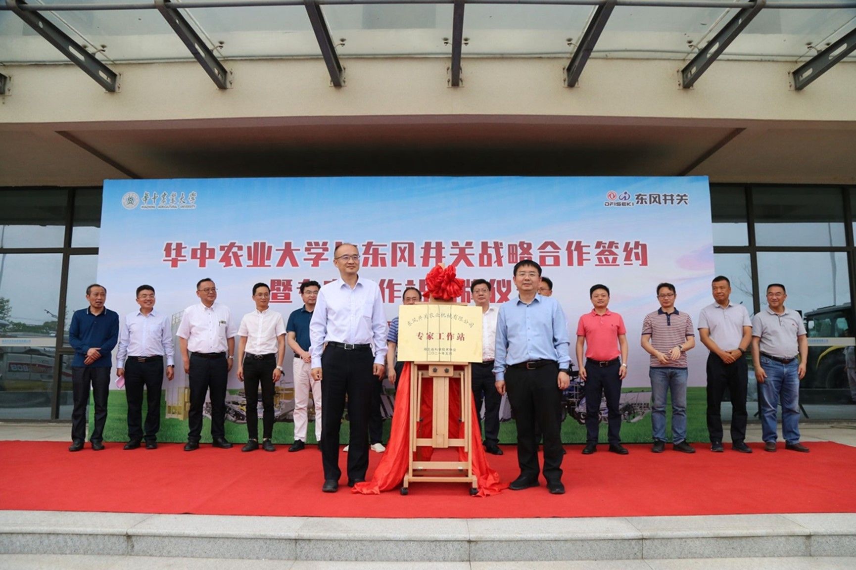 ▲校长严建兵与东风井关董事长卢锋共同为院士专家工作站揭牌