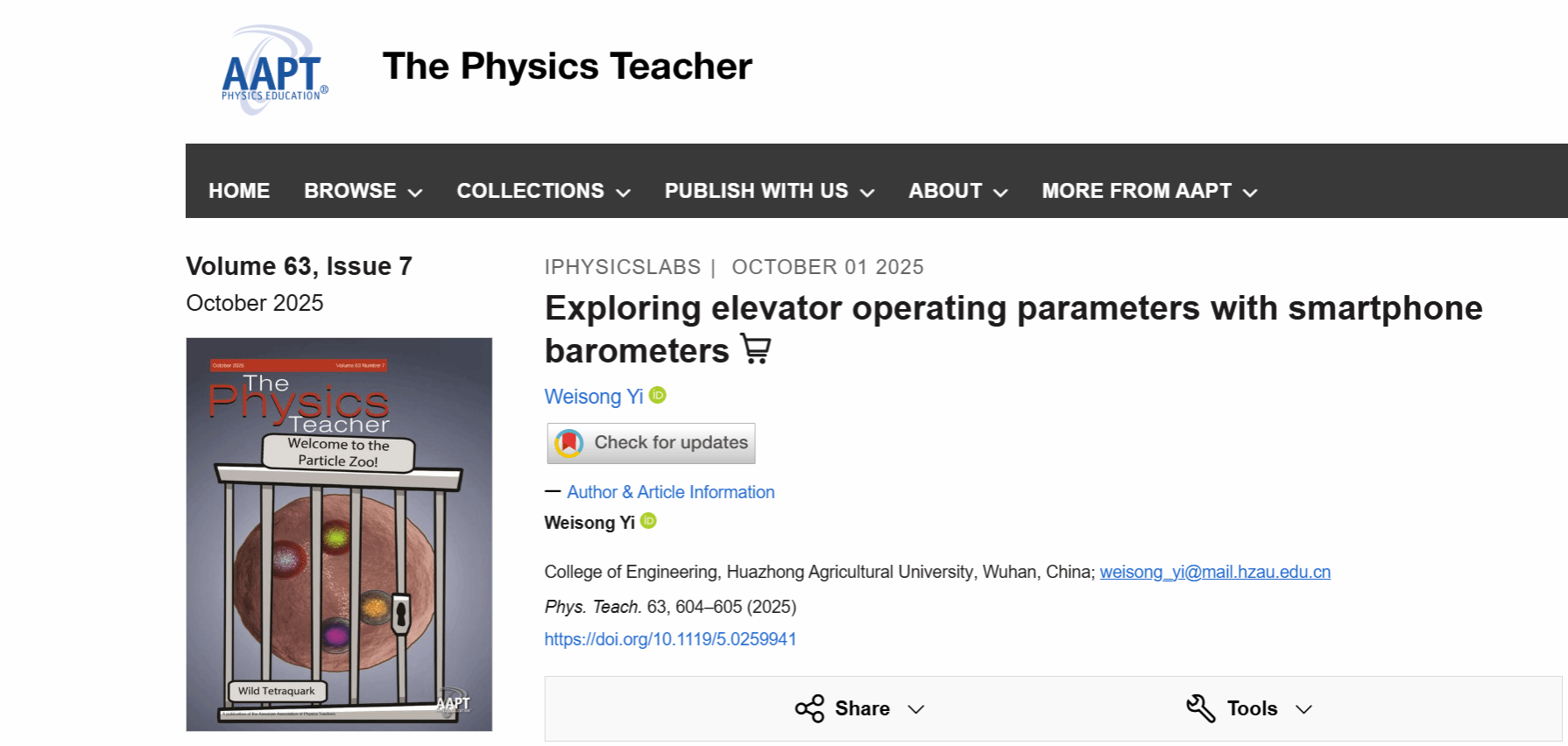 近日,云顶赌场大学物理教学团队在《The Physics Teacher》发表了题为“Exploring elevator operating parameters with smartphone barometers”(Weisong Yi, 2025, Phys. Teach. 63, 604–605.)的物理实验教学研究论文。《The Physics Teacher》是由美国物理教师协会(The American Association of Physics Teachers,简称AAPT)主办的国际知名物理教育教学类期刊,为物理教育研究领域唯一的SCI收录期刊,具有非常高的学术影响力。