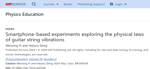 2024年,该团队还在英国物理学会《Physics Education》发表了题为“Smartphone-based experiments exploring the physical laws of guitar string vibrations”(Weisong Yi and Haiyou Deng*, 2024, Phys. Educ. 59, 045039.)的物理实验教学研究论文。易伟松副教授是该文第一作者,通讯作者为邓海游副教授。该文利用智能手机和移动应用程序研究吉他弦线振动规律。通过对吉他弦的长度、直径和振动频率进行定量测量,发现吉他弦线相邻品位对应的弦长比,以及相邻半音频率的比值都接近 2^(1/12) ≈ 1.060,实验结果验证了吉他弦线振动遵循Mason’s Law,并解释了吉他每根弦的粗细不同以及品格距离不均的原因。
